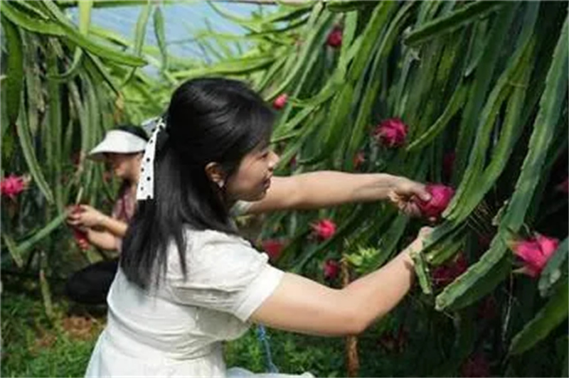 如果说阳光玫瑰是清新的 “绿宝石”,那园区里的红心火龙果就是热情的 “小灯笼”。走进火龙果种植大棚,眼前的景象十分特别 —— 大片肉质茎干像仙人掌一样舒展,一朵朵硕大的火龙果花曾在夜间绽放,而在茎干顶端,一个个红彤彤的火龙果垂挂着,表皮布满绿色的小尖刺,像一个个可爱的小灯笼,透着满满的热带风情。采摘火龙果也是一场有趣的体验,小朋友们可以在家长的指导下亲手采摘,感受 “收获” 的成就感。而且红心火龙果富含花青素和膳食纤维,好吃又健康,带回家做成果汁、沙拉,都是不错的选择。