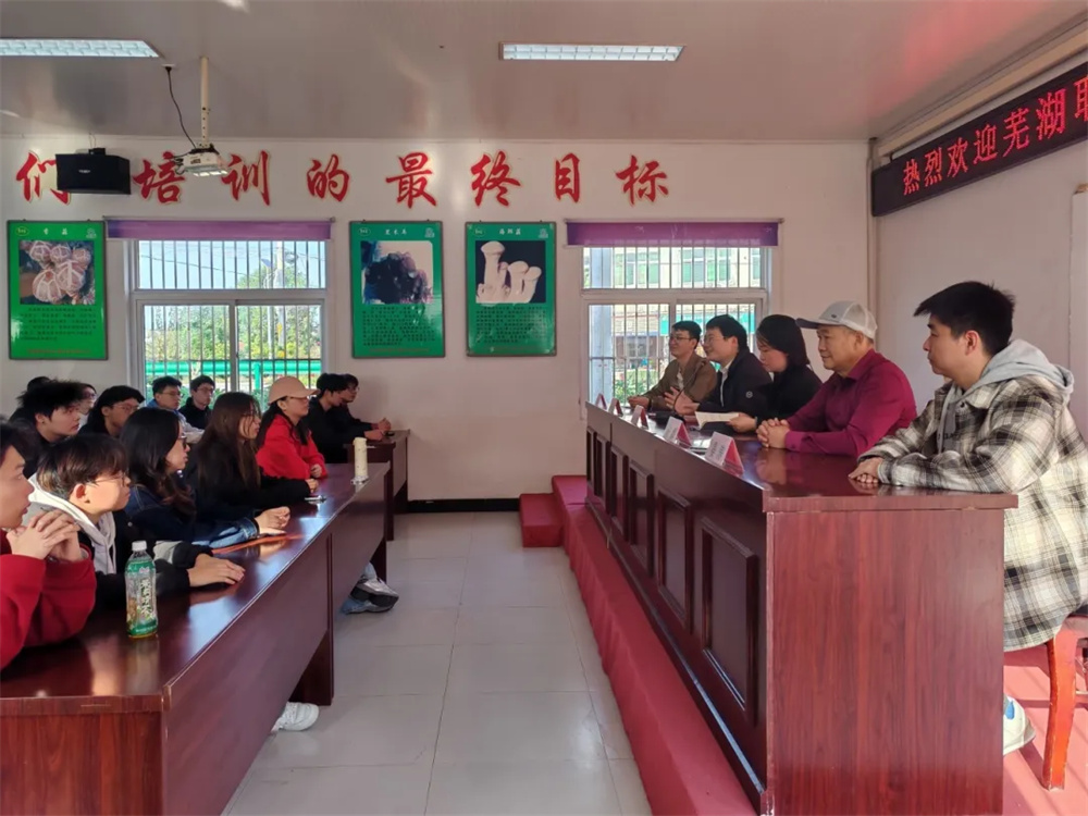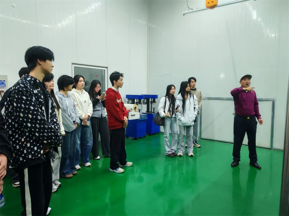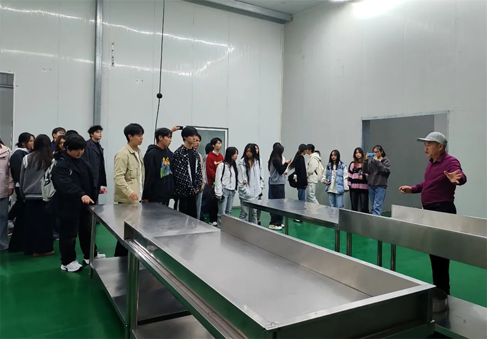 步入宽敞明亮的智能化生产车间,一条条自动化菌袋生产线正有条不紊地运转,高压灭菌柜等现代化设备一应俱全。最令师生们印象深刻的是,整个车间通过40台套智能感知与控制系统,对温度、湿度、光照等关键环境因子实现了全天候、高精度的自动调控,彻底颠覆了传统农业“靠天吃饭”的生产模式。许忠董事长介绍,这套由企业自主集成应用的智能化环控系统,能够为不同菌类的生长创造最适宜的环境,不仅显著提升了单位产量和产品品质,也充分展现了现代智慧农业的核心竞争力。车间内寥寥数名的技术人员与高效运转的智能设备所形成的鲜明对比,让同学们对“科技赋能产业”有了最直观而深刻的体会。